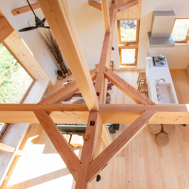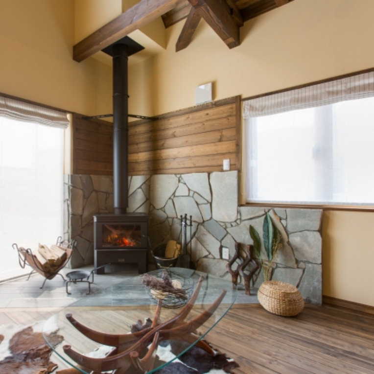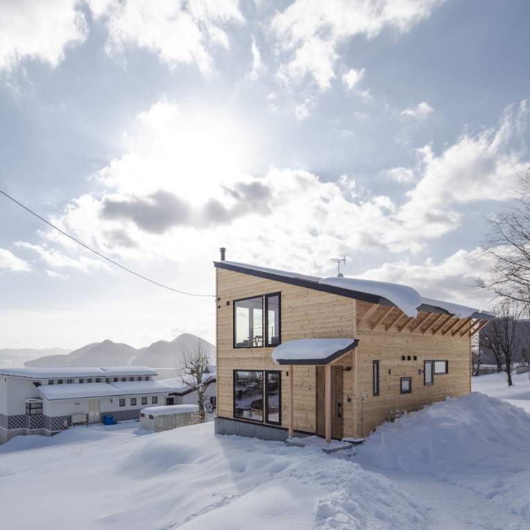 洞爺湖を眺める高台に、夫婦と猫が選んだ小さな家。 薪ストーブのぬくもりと、自然に寄り添う暮らしを心地よく楽しむ住まいです。