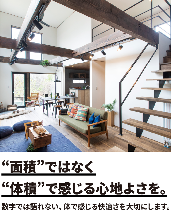 土屋建設の住まいは、横の広がりだけでなく、縦へのゆとりを大切にしています。一般的な住宅より高めの天井設計。そこに無垢の梁や柱が美しく馴染み、目に入る景色まで心地よく整えてくれます。構造には、丈夫でしなやかな木材を用い、断熱性をしっかり確保。だからこそ、吹き抜けや大きな窓も、安心して設計できるのです。光がめぐり、空気が循環する空間。その開放感は、数字では語れない、体で感じる快適さをもたらします。