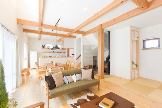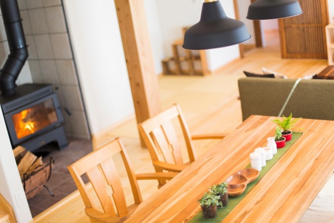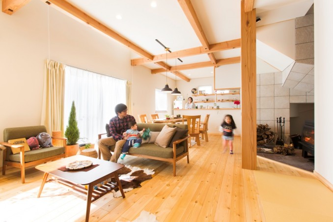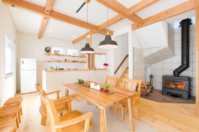 中央には存在感のある薪ストーブを設置、北海道の長くて寒い冬の時期にも、薪ストーブを中心に家族の会話が弾みます。
