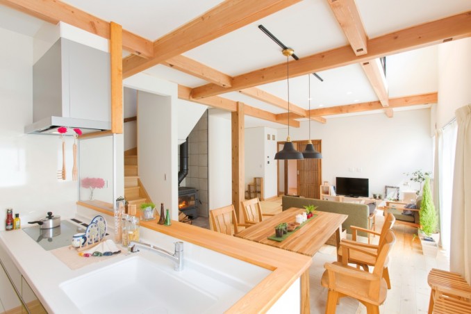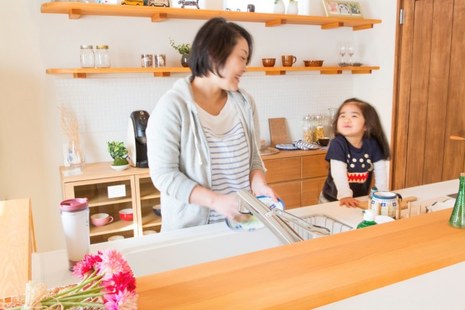 使いやすさを考え、キッチンの正面にはダイニングテーブルを配置、家族の様子をみながらキッチンでもみんなと楽しい時間を過ごせます。