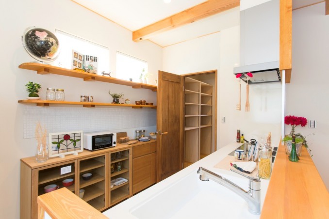 キッチン横には、大きな収納庫を設け、食品や大きな鍋など、ストック品を大量に収納できるスペースになっています。