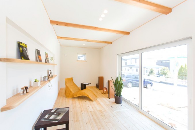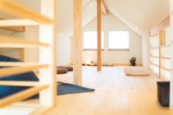 斜めの低い天井が何故か落ち着く快適空間です。南東の窓からは、地元の山々が見えるとても癒される場所となりました。