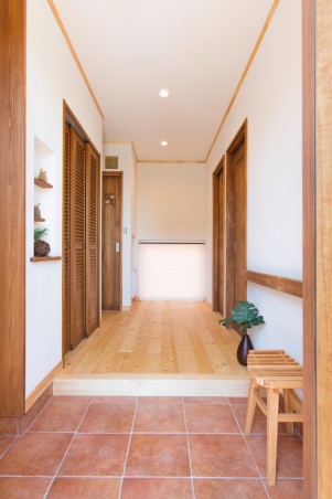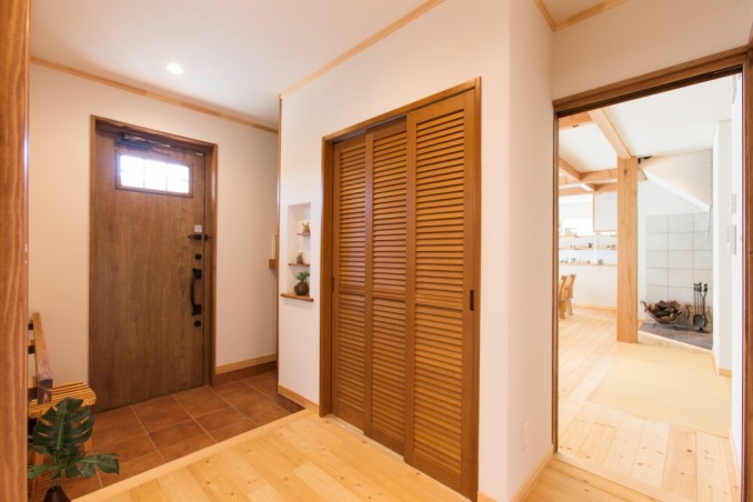 玄関には、ベビーカーや薪のストックが出来る様に土間スペースを広めに計画し、コートを掛けれるスペースを設けました。