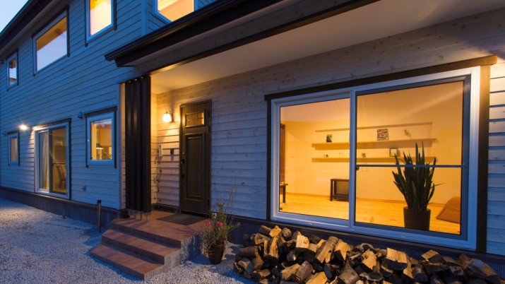 室内からの景観を壊さないように、南西面の大きな窓越しにある道路からの目線を避けるため、薪置き場を配置しました。