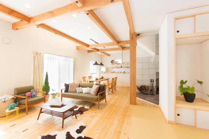 赤松の床板、米松梁、壁には珪藻土クロスを採用いたしました。