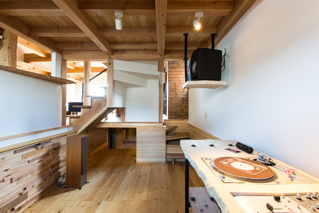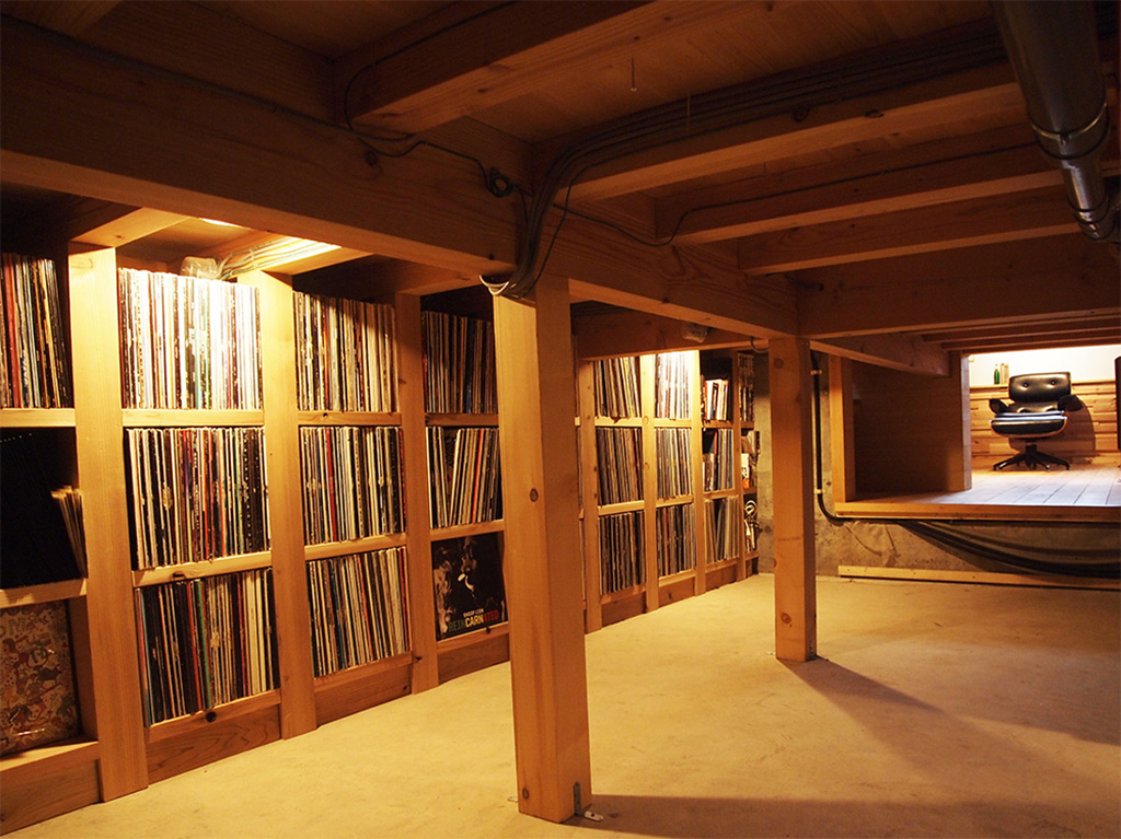 レコードをゆっくりと聴ける自分の部屋からつながる「基礎部分」の床下に収納したレコード置き場は、一人っきりでゆっくり考え事をしながらレコードを探したりすることもできる秘密基地。
