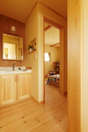 2階のホールには、無垢材で仕上げたオリジナル洗面台を設計いたしました。 2階に居ながら使用できる水場を設け、ご両親がわざわざ1階に降りてこなくても良い様に配慮しています。 他、2階にはタモの床材で仕上げたトイレも設置しています。