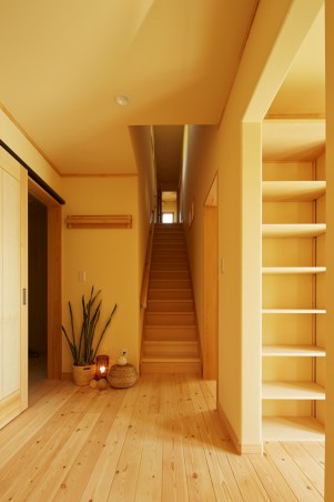 オーナー様は、以前より木の家にとても興味をお持ちだったとのことで、モデルハウスを見て ”私たちの住みたい家はこれだ!”と感じたそうです。今まで見ていた他社の新築住宅とまったく違う造りに驚きを感じ玄関ドアを開け、入ったときの木の香りが強烈なインパクトとして今も記憶に残っているそうです。
